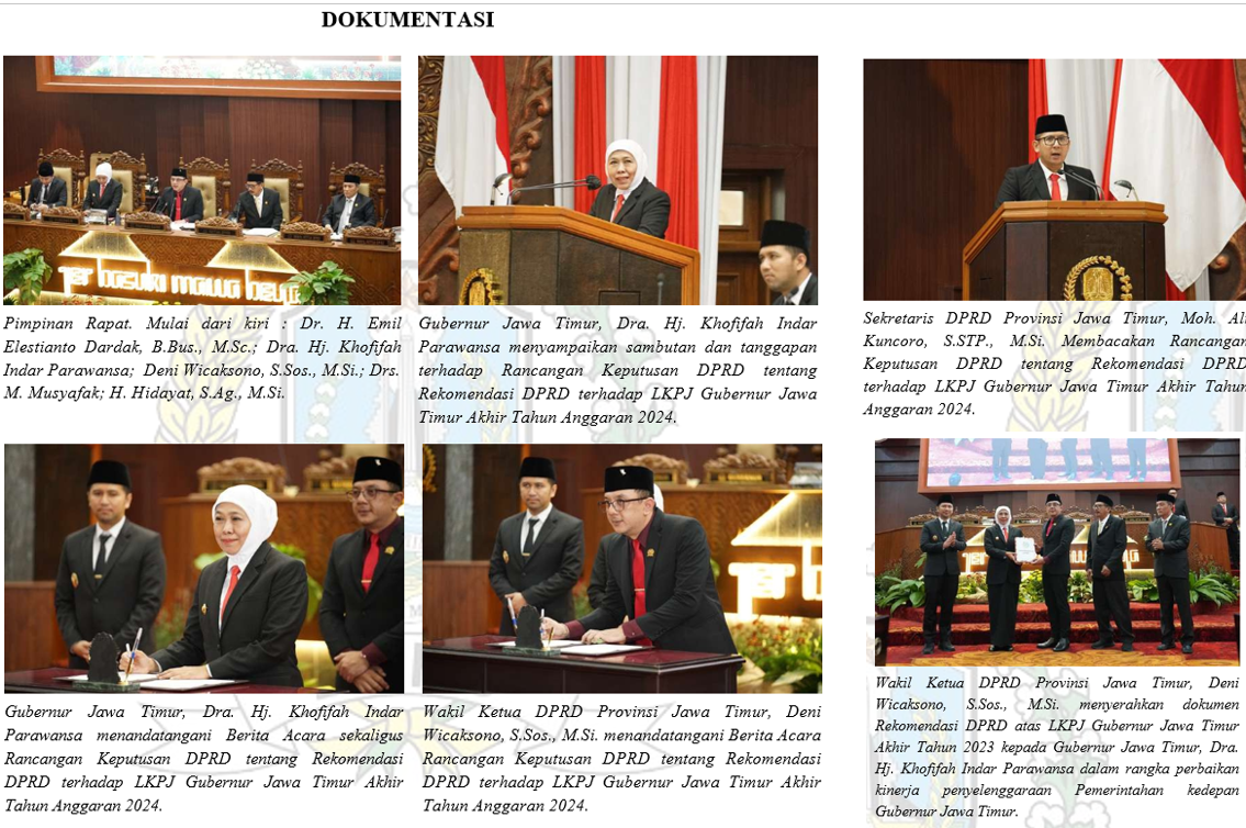 DPRD Provinsi Jawa Timur telah menyampaikan bahwa Rekomendasi DPRD atas Laporan Keterangan Pertanggungjawaban (LKPJ) Gubernur Jawa Timur Akhir Tahun Anggaran 2024 dapat digunakan dalam penyusunan perencanaan pada tahun berikutnya. Hal ini disampaikan oleh Gubernur Jawa Timur Khofifah Indar Parawansa, pada agenda Rapat Paripurna yang juga dihadiri oleh Wakil Gubernur Jawa Timur, Emil Elestianto Dardak, dan dipimpin oleh Wakil Ketua DPRD Provinsi Jawa Timur, Deni Wicaksono, S.Sos., M.Si., 79 anggota DPRD dan Sekretaris Daerah Provinsi Jawa Timur. (19/05/2025)