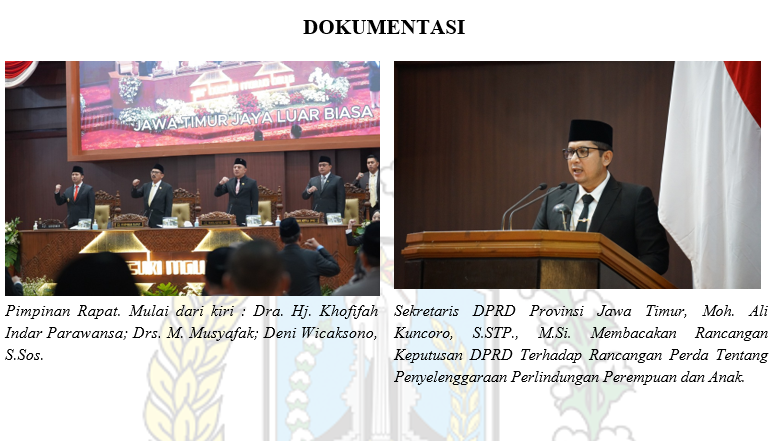 DPRD Provinsi Jawa Timur secara resmi menyetujui Rancangan Peraturan Daerah (Raperda) tentang Penyelenggaraan Pelindungan Perempuan dan Anak sebagai Raperda Inisiatif DPRD.